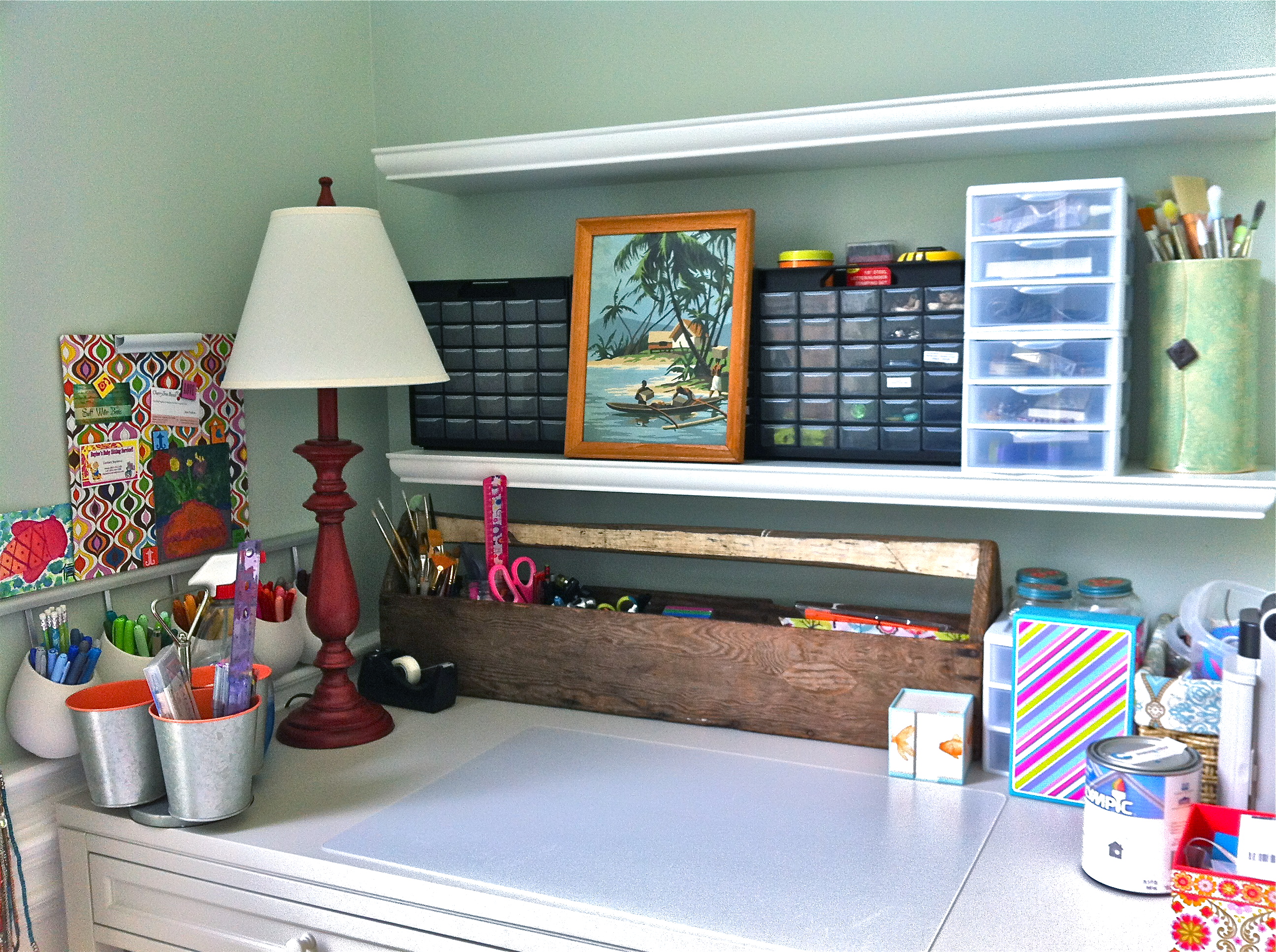 My mom recently gave me an old tool box that belonged to my “Papaw Sellers” and I love it on my desk, it holds my pens and pencils without showing the containers that are not very attractive. I could not ask for a better spot for it!