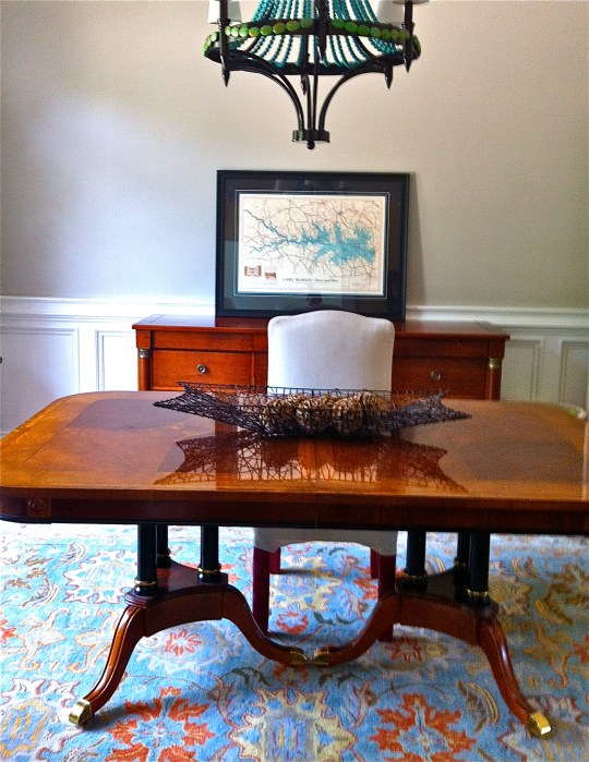 I added the rug to the dining room and I am really liking the contrast between the colors of the rug and the wall color! I have to get rid of the dining table because I have an old quarter-sawn table that I bought a few years ago that I want to put in the room… after I clean off the dust and spider webs!