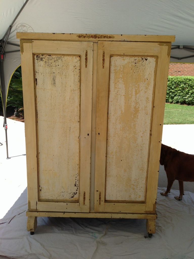 Recently, one of my good friends Tanya brought over a huge wardrobe she had just purchased at an estate sale. As she was unloading it off her truck I started to literally drool. This thing was filthy dirty, had been painted a hideous yellow, had the remains of a rat’s nest in one of the drawers (if you love to pick antiques you have to love animal droppings), the top was coming off and reeked of who knows what, but I was in love at first sight.