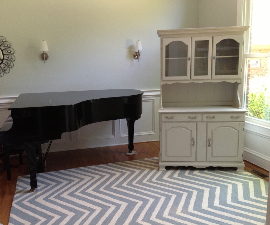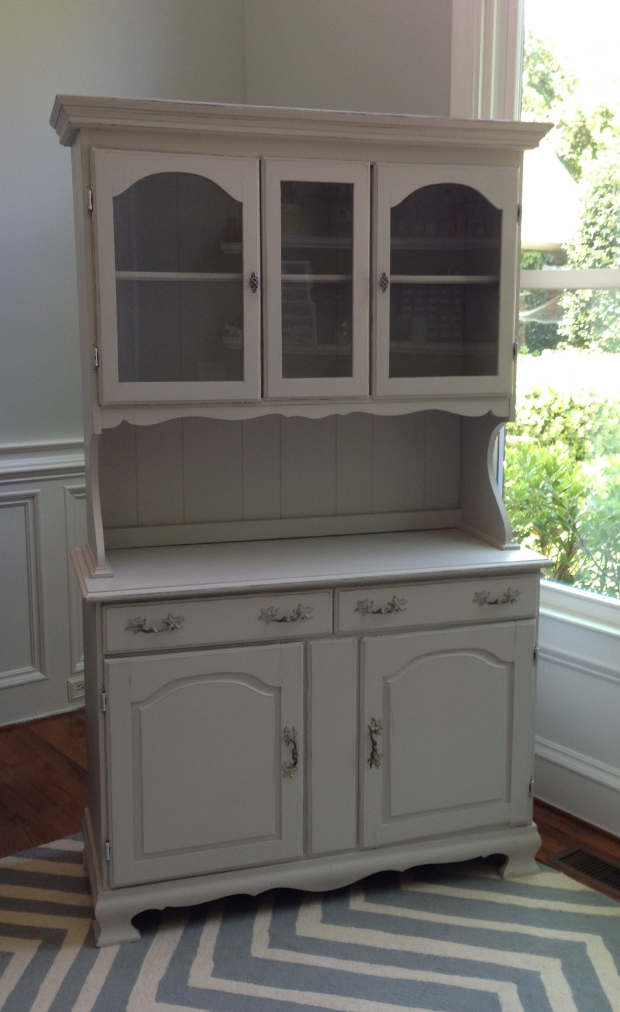 Bought this small china cabinet and decided to paint it Sharkey Gray , a Martha Stewart color, to match my other furniture in my craft room. It turned out beautifully after I distressed it a little and added new hardware!
