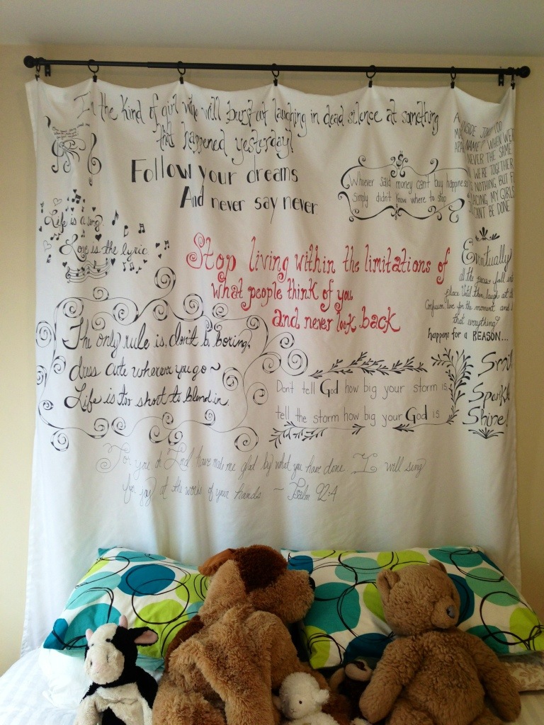 A friend recently asked if I had any ideas for headboards because her daughter is getting a room makeover. I sent her a few ideas I found on Pinterest and one stood out that involved hanging a curtain behind the bed. The fabric had quotes written on it. So I had her to ask her daughter for her favorite quotes and I worked them all into the design. I bought a plain white fabric shower curtain and used a Sharpie pen to write the quotes in all different fonts. I wrote her favorite one in red and the rest were written in black. She requested some extra flourishes and designs to accompany the quotes and this is what I came up with…