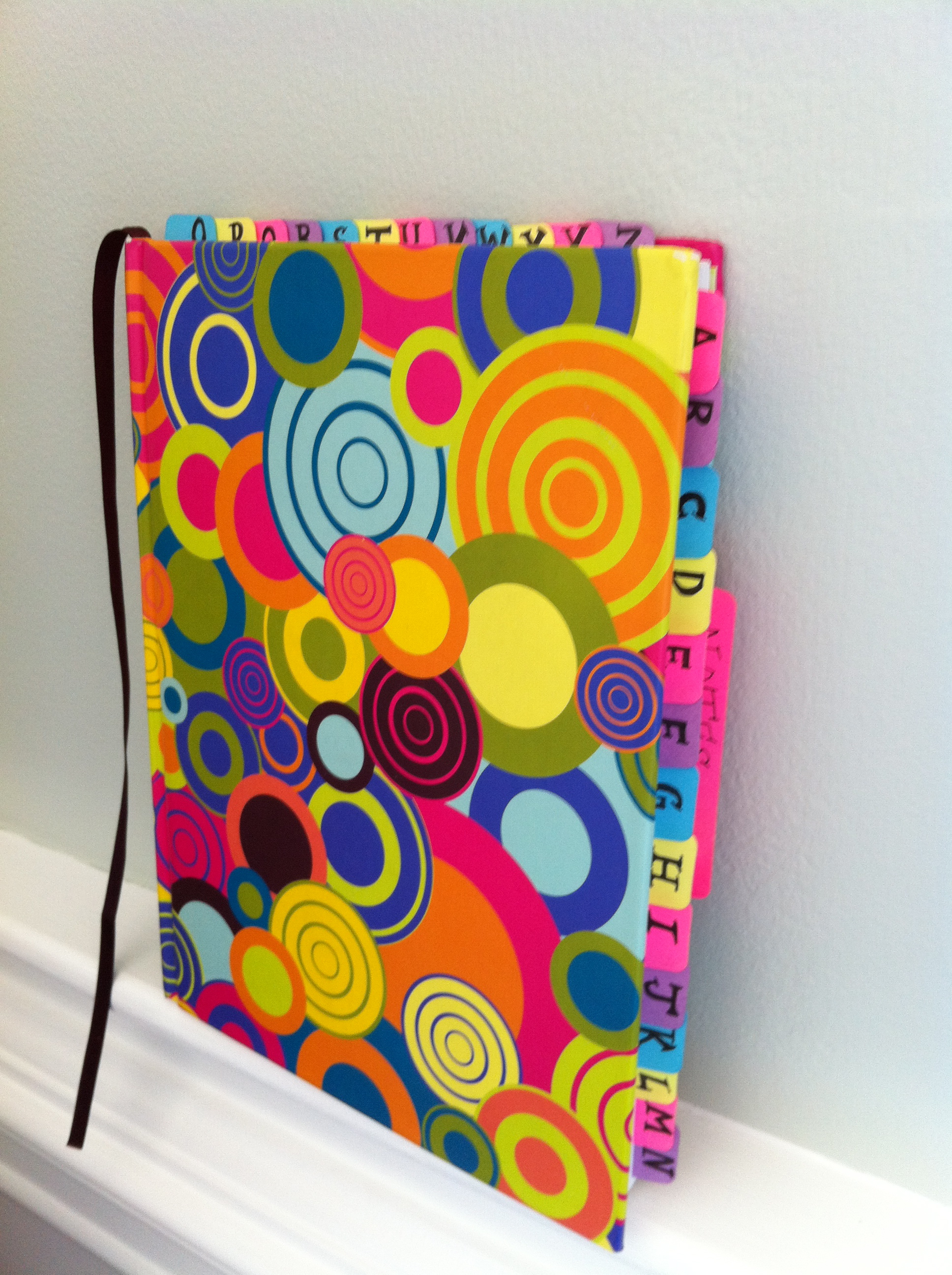 I looked and looked for a journal or book that I could use for my email addresses and website addresses but I never found one that I felt would serve the purpose. So I found a funky journal with lined pages and made my own. I used the Post-It tabs I found at Staples and wrote each letter of the alphabet on separate tabs and attached them to the edges of every couple of pages. Then I added a bigger tab for notes near the end of the journal. Now I have the perfect place to record the information I need for websites and addresses.